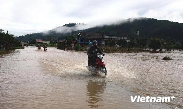 Quốc lộ 20 cũng bị ngập khiến nhiều phương tiện lưu thông khó khăn.