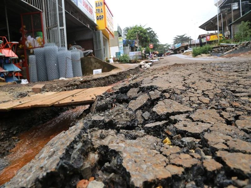 Nhiều đoạn đường bị sạt lở nghiêm trọng sau mưa lũ. Ảnh: HUY TRƯỜNG