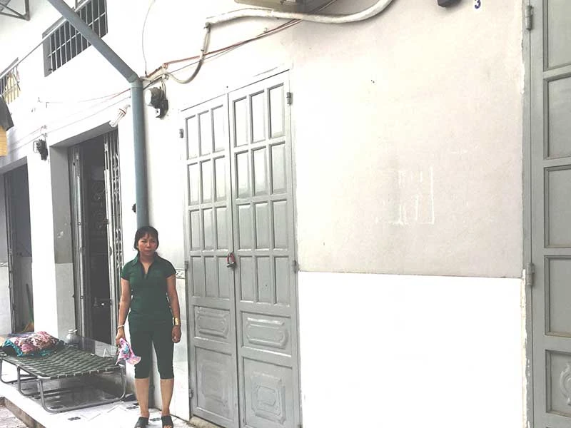 Bà Mai Thị Hồng bên công trình xây sai phép của chủ cũ (buộc tháo dỡ) tại đường Lê Thị Hoa, phường Bình Chiểu, quận Thủ Đức (TP.HCM). Ảnh: CẨM TÚ