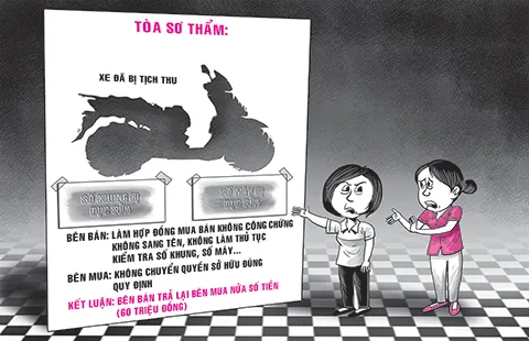 Làm việc với tòa, bà T. thừa nhận có bán chiếc xe SH cho bà Đ. Sau khi nhận đủ tiền, bà đã giao bản chính giấy đăng ký xe cùng hợp đồng ủy quyền của chủ trước cho bà Đ. Chiếc xe trên do bà mua lại của ông V. ngày 1-7-2013 với giá 110 triệu đồng; khi mua hai bên cũng không lập thành văn bản, không kiểm tra tình trạng xe.