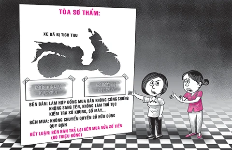 Tuy nhiên, bà Đ. cũng có lỗi trong việc mua bán xe vì không yêu cầu bà T. làm thủ tục chuyển quyền sở hữu theo đúng quy định mà lại sử dụng khi chưa được đứng tên quyền sở hữu xe. Từ đó, tòa tuyên hủy “giấy bán xe”, buộc bà T. phải hoàn trả cho bà Đ. một nửa giá trị tiền của chiếc xe (60 triệu đồng).