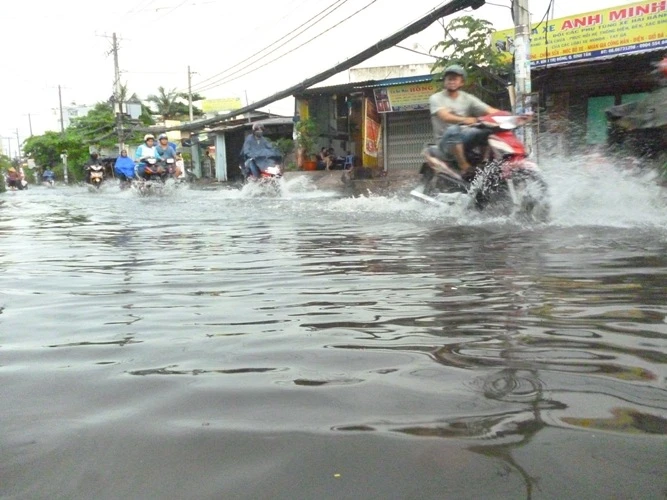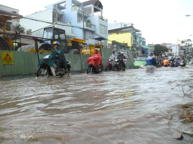 Tại đường Tân Hóa (quận 6) mặc dù lượng mưa không nhiều nhưng tuyến đường này vẫn bị ngập đến hơn nửa bánh xe. Nguyên nhân ngập là do đơn vị thi công nâng cấp đường Tân Hóa thực hiện thi công một bên đường cao hơn, dẫn đến nước đổ dồn sang một bên.