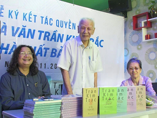 Vợ chồng nhà văn Trần Kim Trắc và giám đốc Nhà xuất bản Trẻ Nguyễn Minh Nhựt (trái) trong lễ ký kết tác quyền sáng 4-11. Ảnh: Hòa Bình