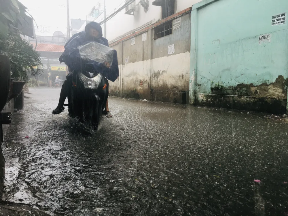 Cơn mưa lớn khiến một số tuyến đường, hẻm nhỏ phút chốc lênh láng nước.