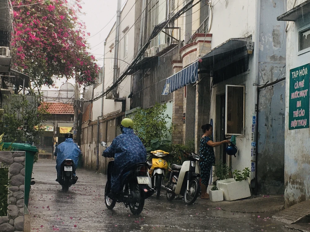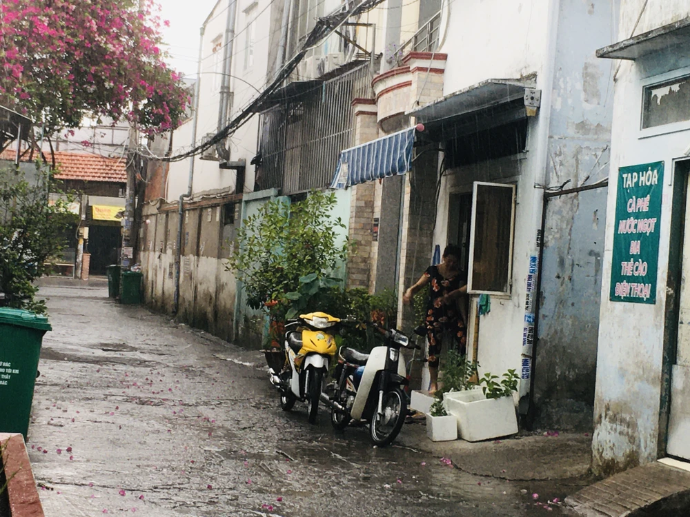 Tại Bình Thạnh, mưa bắt đầu từ khoảng 6 giờ sáng, con hẻm nhỏ vẫn còn khô ráo. Ảnh: NGUYỄN TRÀ