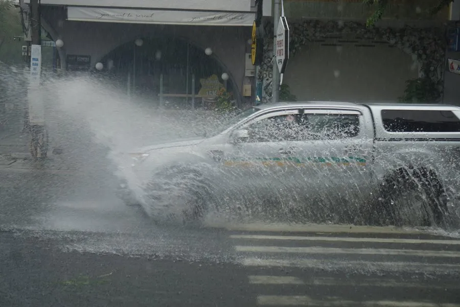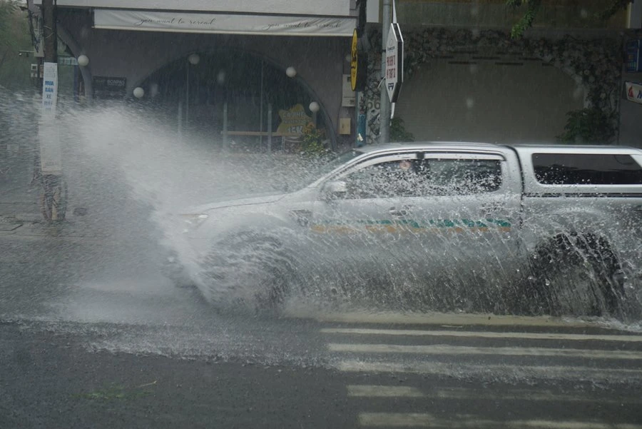 Nước ngập nửa bánh xe trên đường Trần Phú. Ảnh: TẤN VIỆT