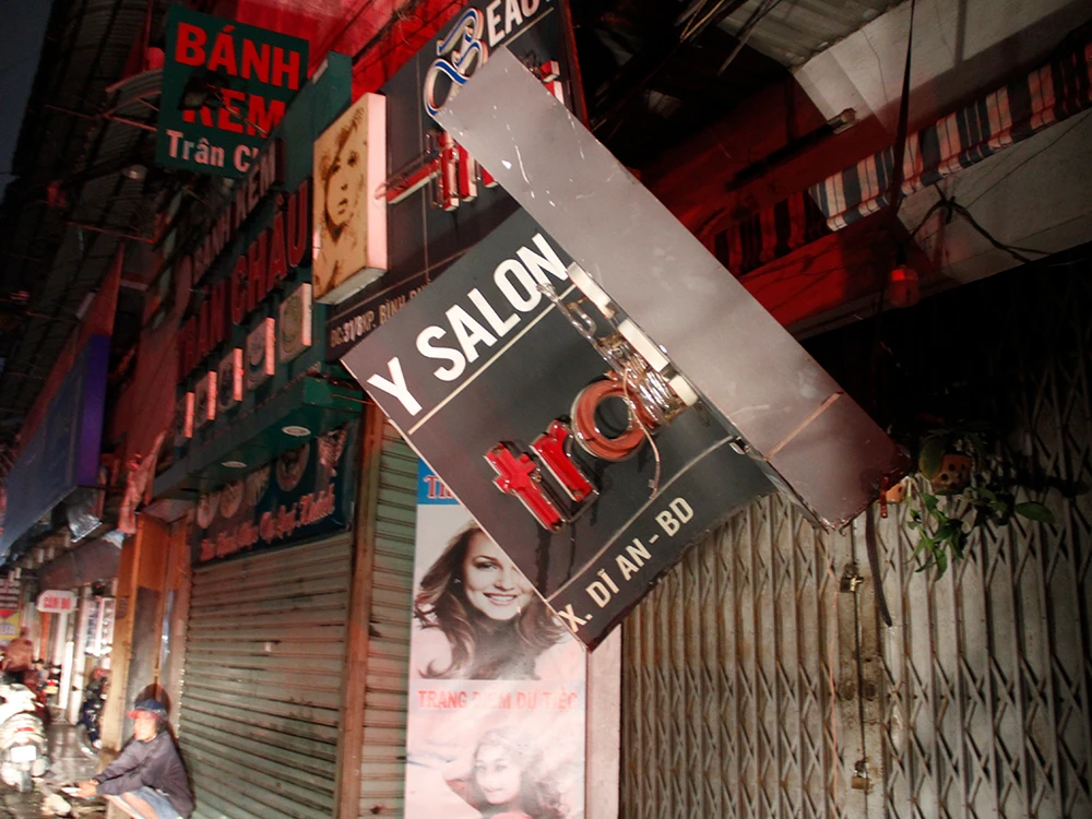 Gió lốc mạnh kèm mưa khiến cho địa bàn tỉnh Bình Dương cũng bị ảnh hưởng khi có nhiều cây xanh, bảng hiệu gãy đổ.