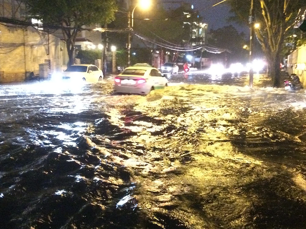 Cơn mưa kéo dài hơn 1h đồng hồ, đường Quốc Hương (quận 2) mênh mông biển nước.