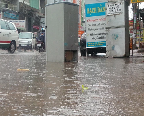 Đường Bạch Đằng quận Tân Bình hướng ra vòng xoay Nguyễn Thái Sơn lênh láng nước do tuyến đường đang thi công, hệ thống cống hoạt động kém.