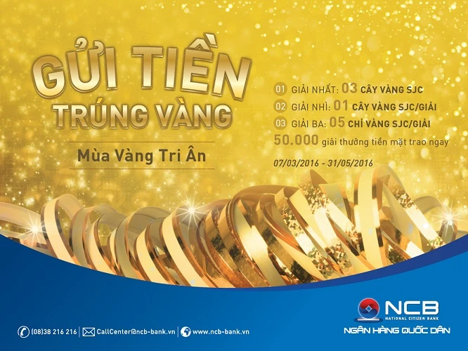 Từ ngày 7-3 đến 31-5, Ngân hàng TMCP Quốc Dân (NCB) triển khai chương trình ưu đãi “Mùa vàng tri ân” với tổng giá trị giải thưởng hơn 1,5 tỉ đồng dành cho khách hàng gửi tiết kiệm tại NCB. Theo đó, các khách hàng cá nhân khi gửi tiết kiệm từ 50 triệu đồng kỳ hạn một tháng trở lên sẽ được tặng thẻ cào điện tử trúng thưởng tiền mặt tại chỗ với giá trị thẻ 1 triệu đồng. Ngoài ra, với mỗi 10 triệu đồng gửi tiết kiệm, khách hàng sẽ nhận được một phiếu dự thưởng để tham gia quay số cuối chương trình với nhiều phần quà giá trị là vàng SJC, gửi càng nhiều, cơ hội trúng thưởng càng cao.