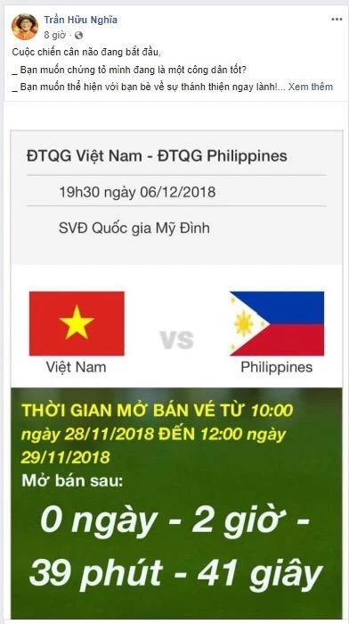 Trong số đông người truy cập không được có Chủ tịch Hội Cổ động viên Việt Nam VFS, ông Trần Hữu Nghĩa. Để mọi người tin là ông mua thật, ông Nghĩa còn “trưng” cả clip ông vào mạng mua vé với dòng cảm thán: “Để mình kể lại quá trình mình đặt vé hồi sáng cho bà con tường tận nha! Mình đã liên tục thầm nghĩ lại rằng... Không biết mình có phạm lỗi gì với VFF không mà đăng ký gian nan vẫn không được…”.