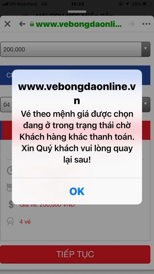 Lại phải quay lại thủ tục mua vé thì lúc đấy trang web lại hiện lên dòng chữ thông báo tên xxx, số điện thoại xxx, email xxx (đã khai trước đó) đã có người mua (!?).