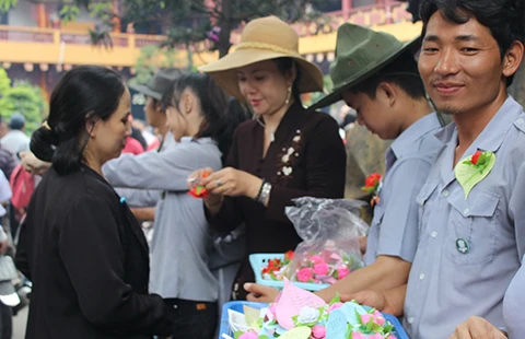 Đối lập với không khí xô bồ hối hả, tấp nập bên ngoài, bên trong chùa Vĩnh Nghiêm (quận 3) chìm trong nghi ngút khói hương và tiếng tụng kinh, gõ mõ. Nhiều người đến đây cầu khấn những điều tốt đẹp đến với cha mẹ. Mỗi người đều được cài lên áo một bông hồng đỏ, hồng, vàng hoặc trắng tùy theo cha mẹ còn hay mất.