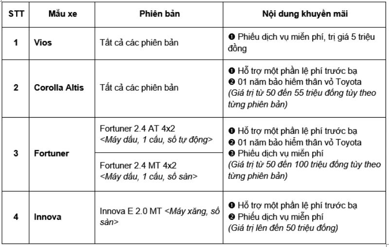 Trong chương trình tri ân của hệ thống đại lý Toyota, sẽ có mức ưu đãi lên tới 100 triệu cho khách hàng mua xe lắp ráp trong nước (CKD), bao gồm hỗ trợ lệ phí trước bạ, một năm bảo hiểm thân vỏ, phiếu dịch vụ miễn phí (tùy từng mẫu xe), dành cho khách hàng mua xe Vios (tất cả phiên bản), Corolla Altis (tất cả phiên bản), Fortuner 2.4 AT 4x2 (FK), Fortuner 2.4 MT 4x2 (FG), Innova E 2.0 MT (IE&IEB) và hoàn tất thủ tục thanh toán 100% giá trị mua xe trong thời gian nói trên.