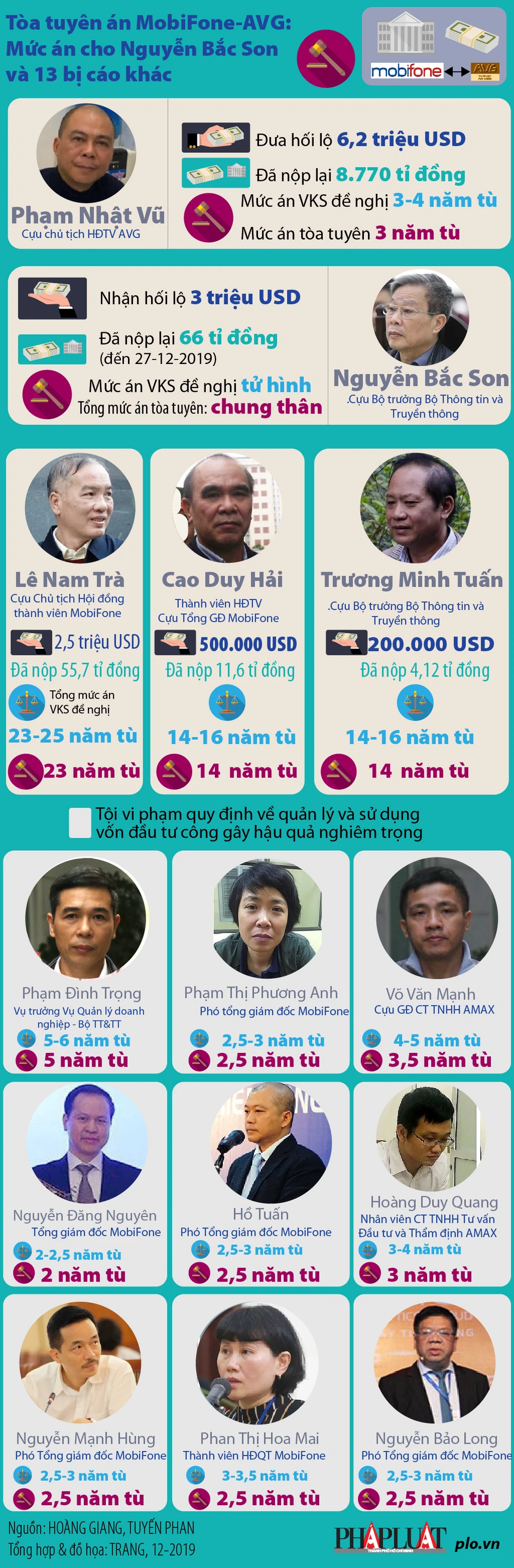 (PLO)- TAND TP Hà Nội vừa tuyên án đối với 14 bị cáo trong vụ MobiFone - AVG, gây thiệt hại cho Nhà nước gần 6.600 tỉ đồng, trong đó cựu bộ trưởng Nguyễn Bắc Son bị phạt mức án chung thân cho cả hai tội danh.