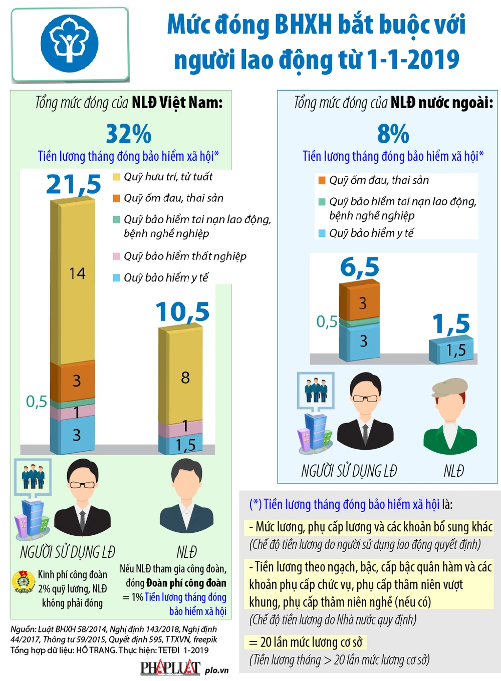 (PLO)- Mức đóng bảo hiểm xã hội (BHXH) bắt buộc của người lao động (NLĐ) từ ngày 1-1-2019 như sau.