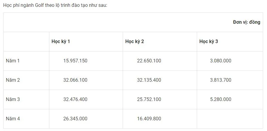 Ngoài ra, trường còn quy định các mức học phí riêng cho ngành Golf. Cụ thể như sau: