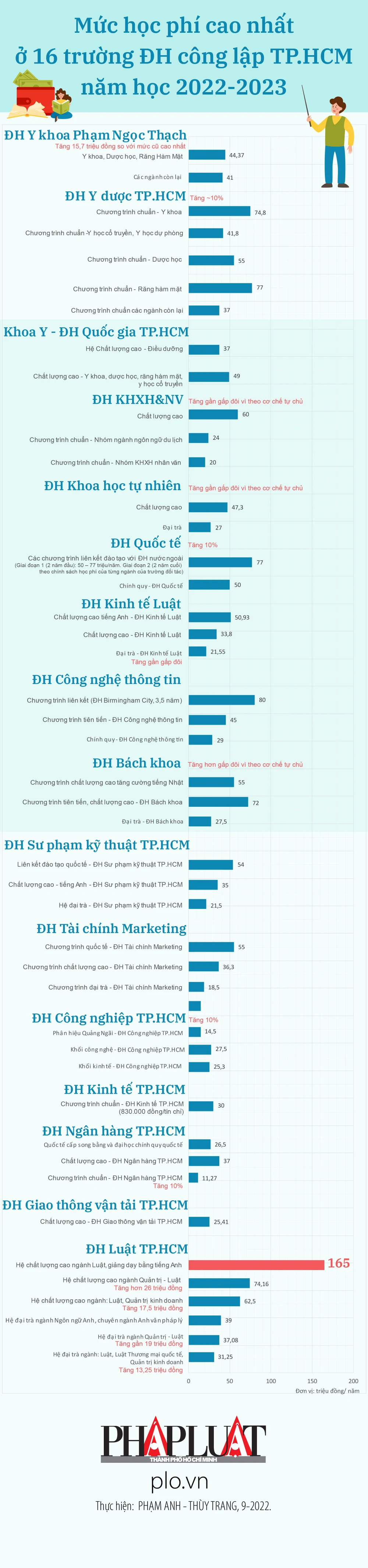 Năm học 2022-2023, ngoại trừ các trường tư thục, đa số các trường đại học công lập tại TP.HCM đều có mức tăng học phí mới. Trong đó, có những trường tăng học phí khá cao, gần như gấp đôi hoặc hơn vì chuyển sang cơ chế tự chủ, không còn phụ thuộc ngân sách nhà nước. Có những trường đã tự chủ từ nhiều năm thì nay tăng học phí theo lộ trình bù trượt giá hoặc áp dụng khung học mới theo Nghị định 81/2021 của Chính phủ.