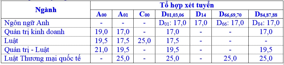Theo đó, điểm sàn năm nay của trường từ 17 đến 25 điểm. Trong đó, Luật thương mại quốc tế là ngành có điểm sàn cao nhất với 25 điểm ở tất cả các tổ hợp xét tuyển. Ngoài ra, ngành Luật ở tổ hợp C00 (Văn, Sử, Địa) cũng lấy điểm tổi thiểu từ 25.