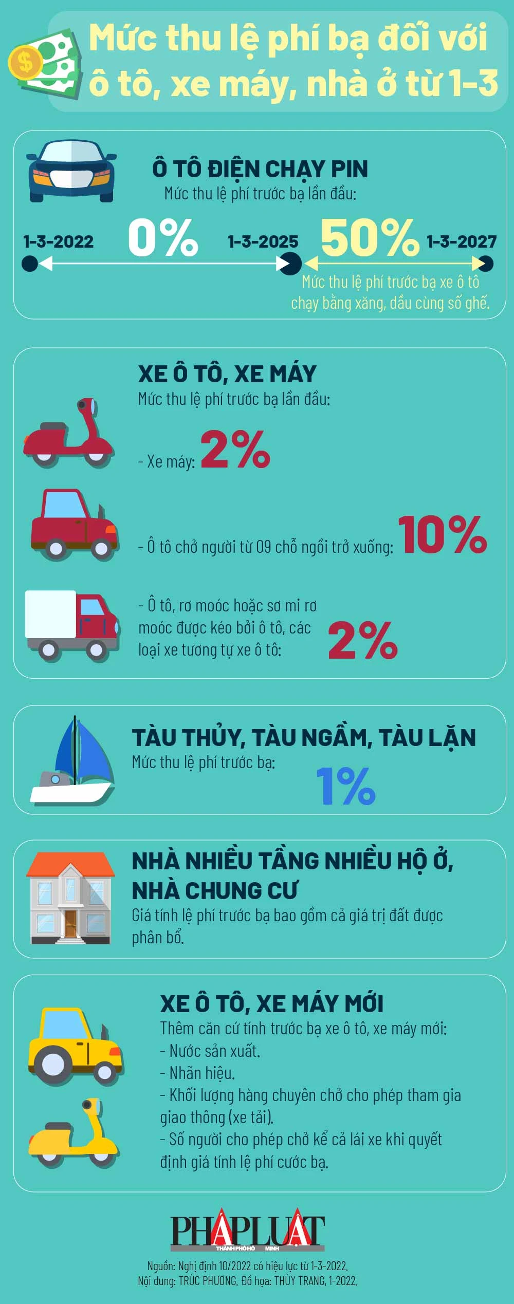 (PLO)- Chính phủ vừa ban hành Nghị định số 10/2022 quy định về mức thu lệ phí trước bạ, có hiệu lực từ 1-3-2022. PLO giới thiệu đến bạn đọc những điểm mới tại Nghị định 10/2022 về mức thu lệ phí trước bạ đối với xe ô tô, xe máy, nhà ở.