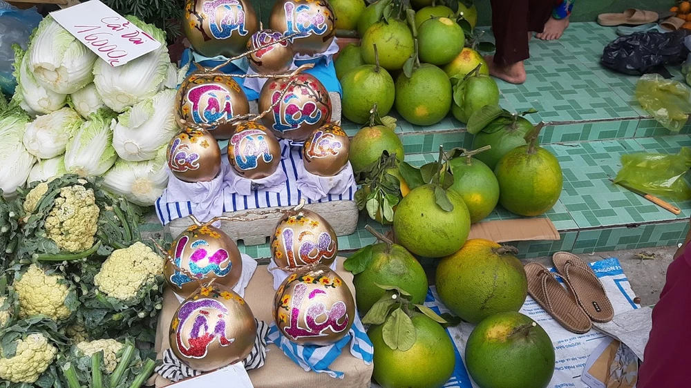 Một số loại trái cây khắc chữ nghệ thuật cũng xuất hiện nhiều ở chợ tết miền quê