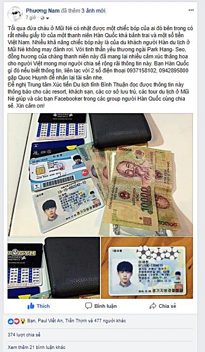 Sáng nay (1-2), vừa thức giấc đã nhận tin của Đỗ Quốc Huynh, ông chủ quán Mr. Burger ở bờ kè Hàm Tiến, Phan Thiết, báo đêm qua nhặt được chiếc bóp của một du khách người Hàn Quốc đánh rơi. Huynh nhờ tôi đăng lên Facebook để tìm khổ chủ.