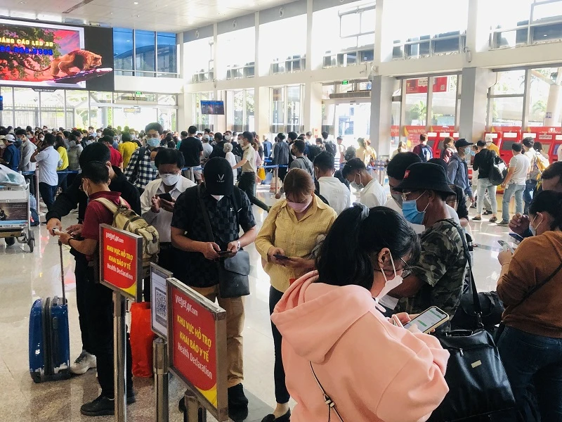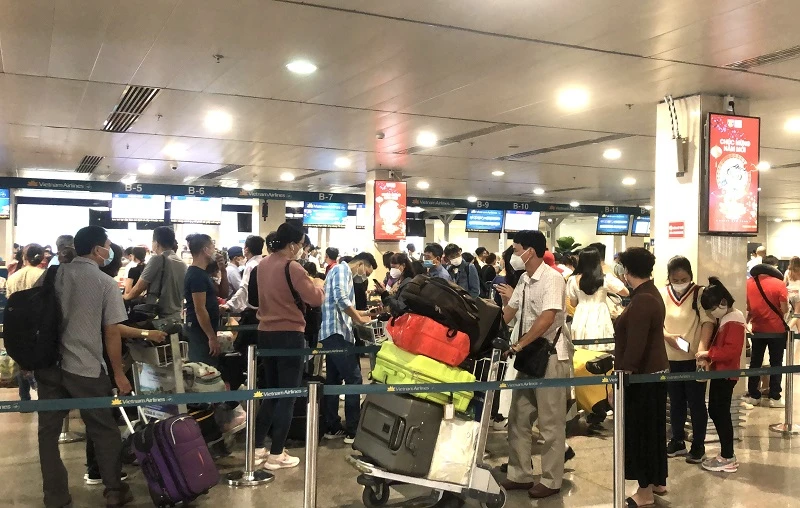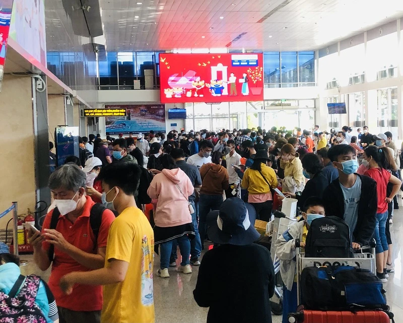 Theo quan sát của phóng viên PLO, dù lượng khách đông đúc sáng đến trưa nhưng không xảy ra tình trạng ùn tắc. Tuy nhiên, khách xếp hàng dài và mất khá nhiều thời gian để làm thủ tục và kiểm tra an ninh.
