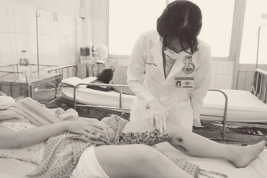 Trước đó, BV tiếp nhận chị TTH (24 tuổi, ở TP.HCM) trong tình trạng vùng da hai bên trong đùi có nhiều vết trợt loét, bề mặt đóng mài đen dày, mưng mủ, chảy máu… khiến chị đi lại và vận động rất khó khăn.
