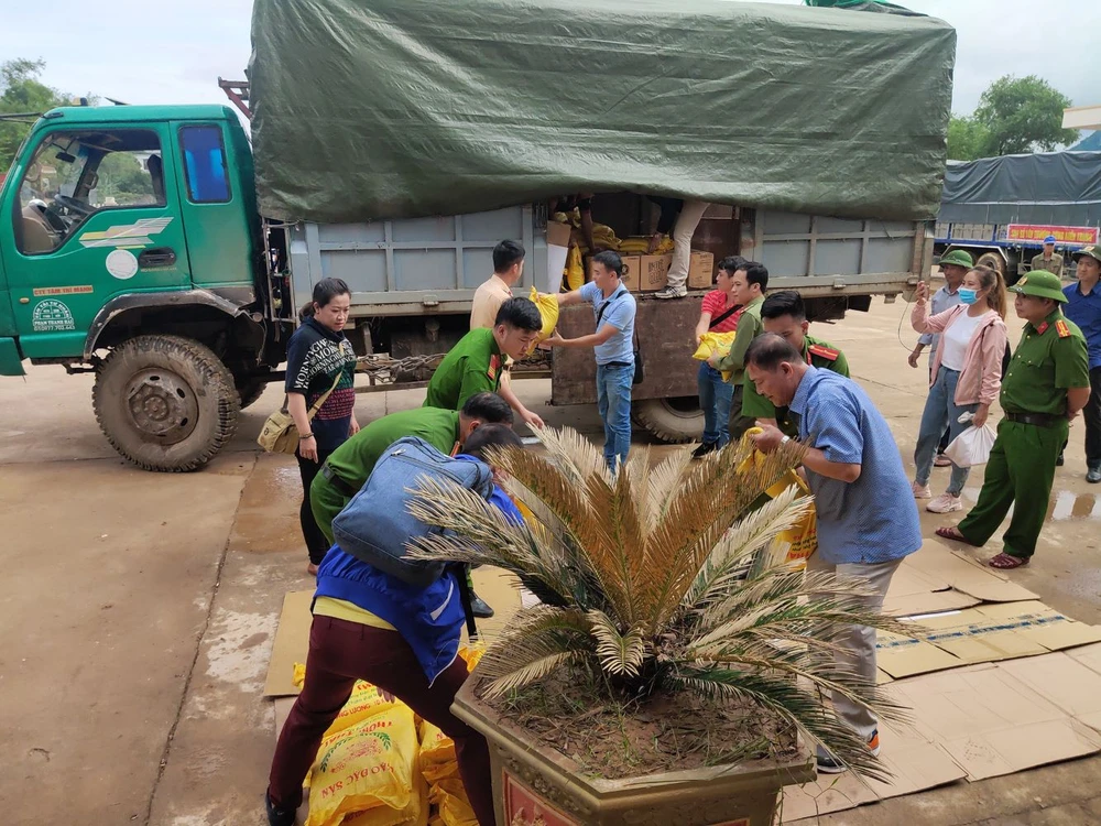 Đoàn của Hội Doanh nghiệp quận Bình Tân, TP.HCM cùng công an huyện Tuyên Hóa, tỉnh Quảng Bình bốc xếp hàng cứu trợ cho bà con tại huyện Tuyên Hóa.