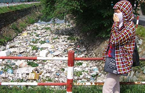 Người đi đường phải bịt mũi khi đi qua kênh 19-5 đầy rác, phường Bình Hưng Hòa, quận Bình Tân.