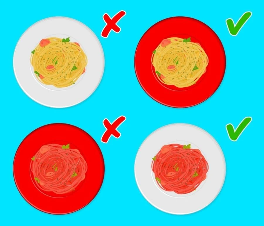 Giả sử, bạn có hai đĩa trắng và đỏ, bạn cần phải phục vụ mì ống trộn sẵn với sốt alfredo trắng và nước sốt cà chua đỏ. Nghiên cứu đã chỉ ra rằng nếu bạn đặt nước sốt trắng trên một đĩa trắng, bạn có thể sẽ ăn nhiều hơn. Điều này là do các màu sắc pha trộn với nhau và não bạn không đánh giá được chính xác khẩu phần ăn.