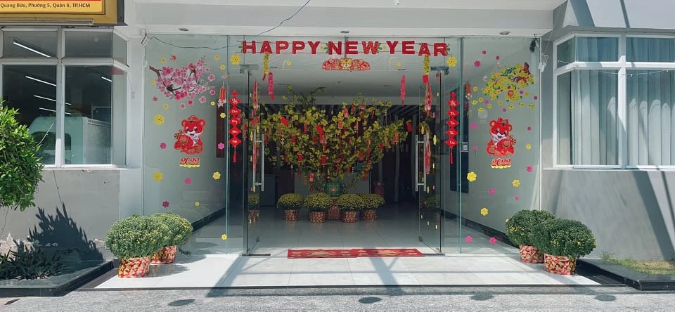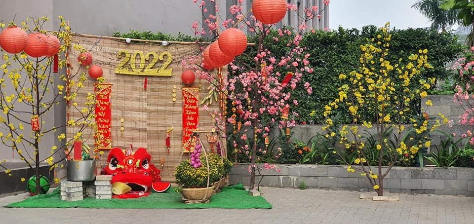 Một chung cư ở TP Thủ Đức trang trí Tết tuy đơn giản nhưng rất bắt mắt. Ảnh: TL