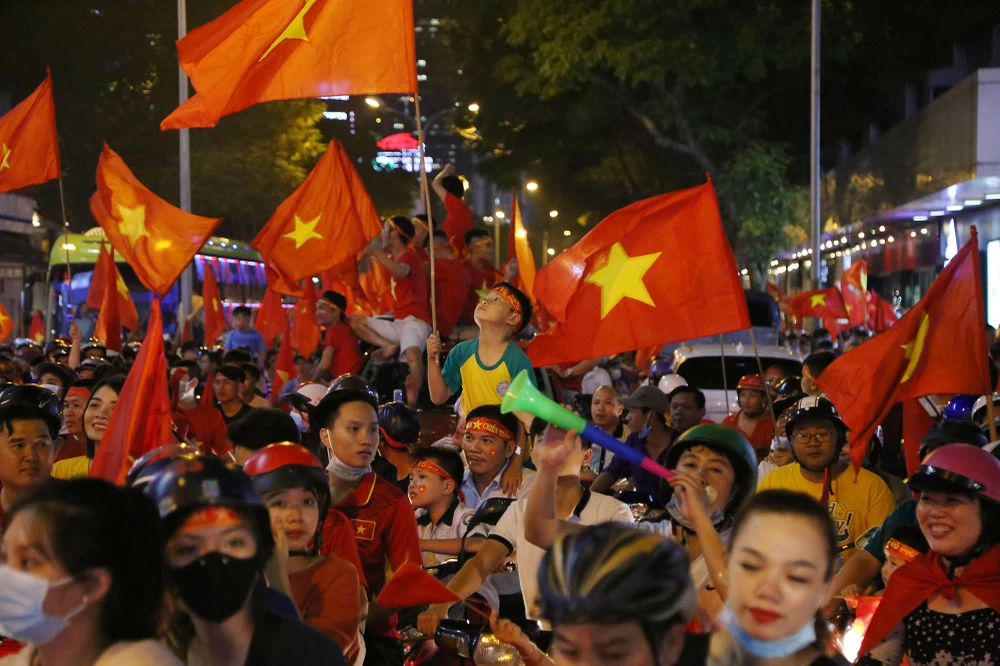 Cả nhà xuống đường hưởng ứng không khí chúc mừng U-23 Việt Nam vào chung kết.