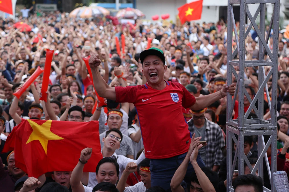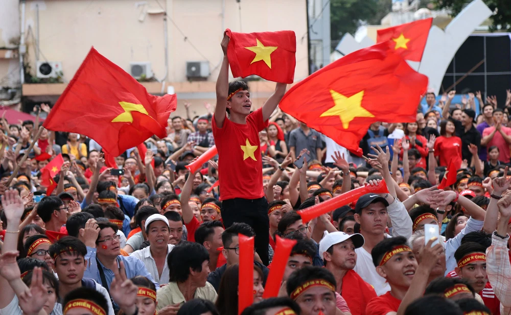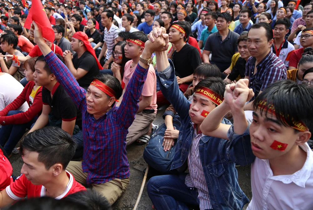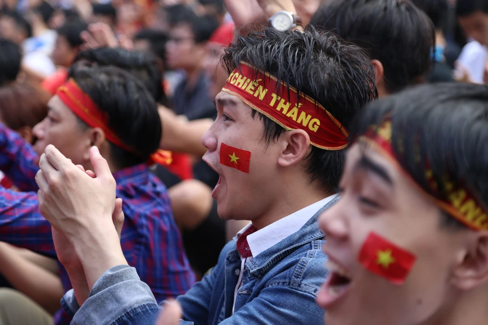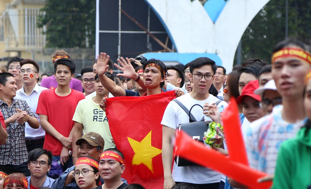 Cổ động viên nắm chặt tay reo hò cổ vũ U-23 Việt Nam.