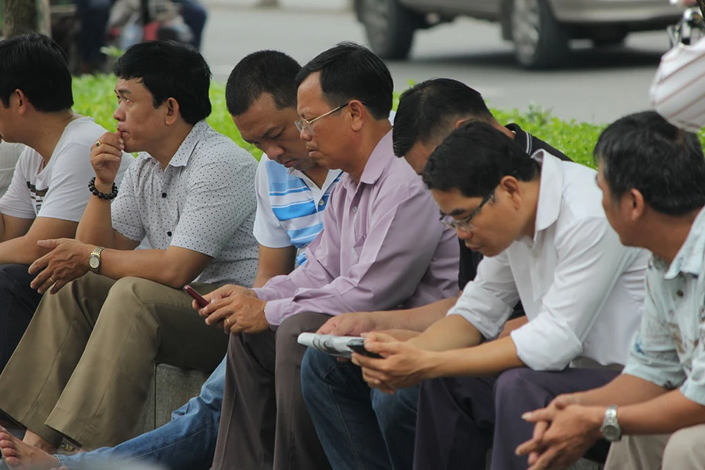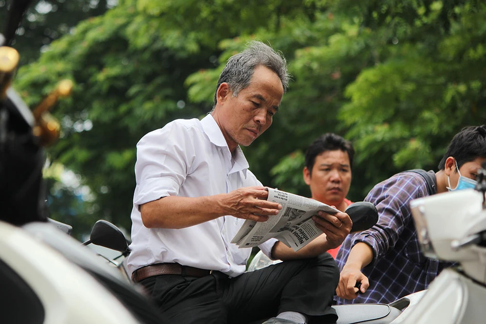 Những ông bố tranh thủ đọc báo, tán gẫu giết thời gian.