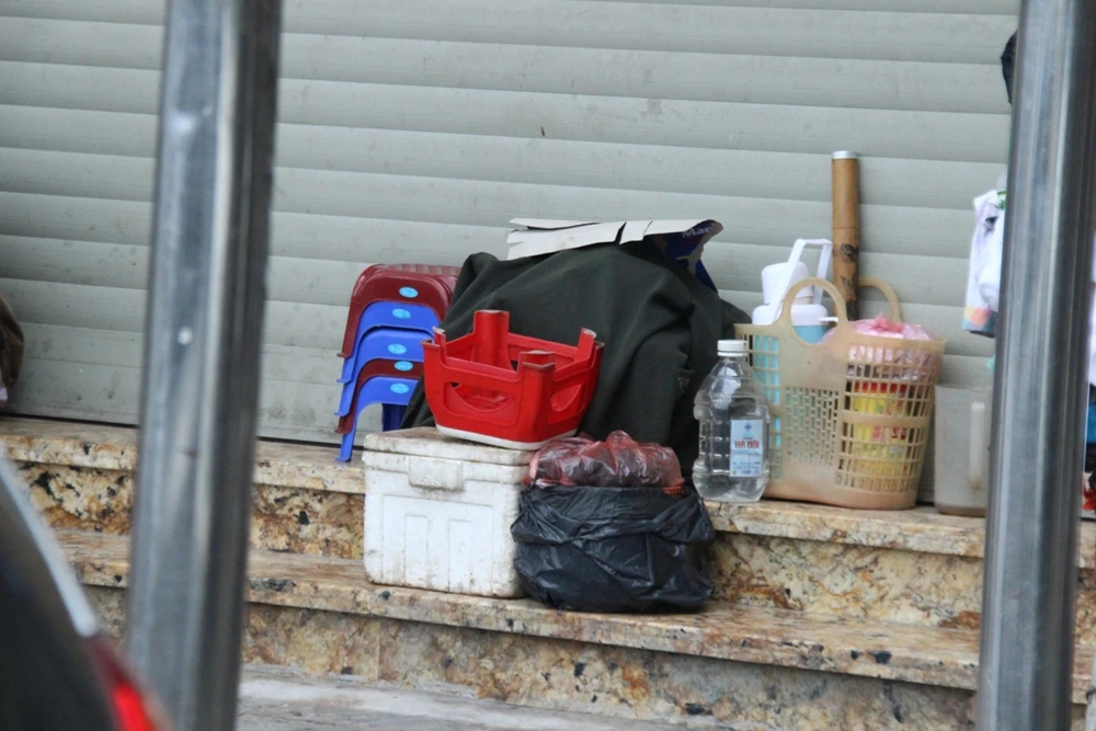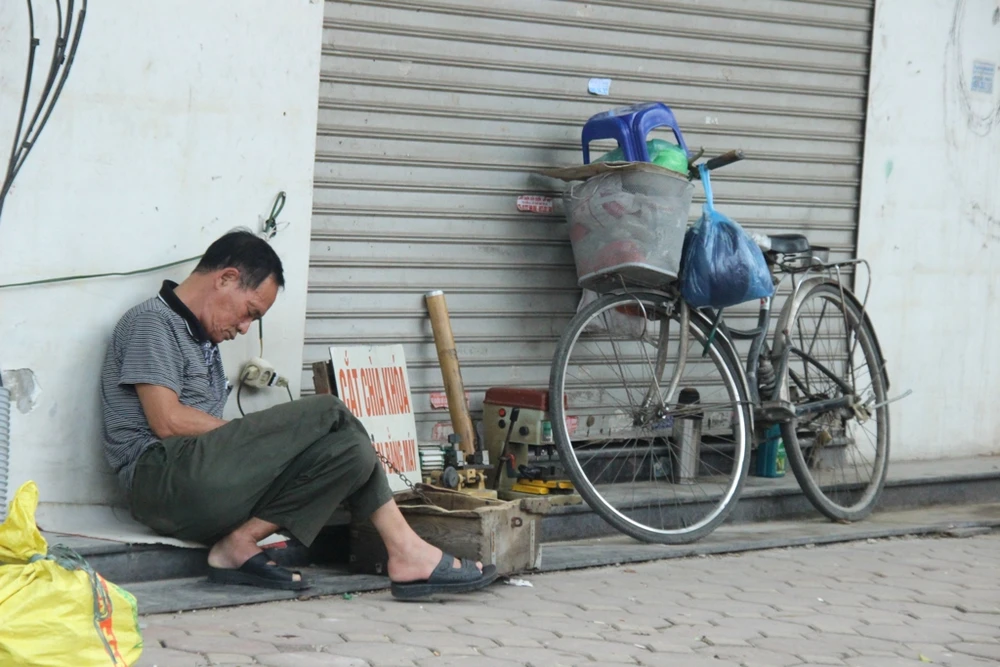 Người đàn ông này tận dụng phần bậc tam cấp phía trước một tiệm trên phố Nguyễn Thái Học đang đóng cửa. Vật dụng hành nghề được ông thiết kế sao cho nhỏ gọn nhất, để có thể di chuyển tới vị trí khác bất cứ lúc nào.