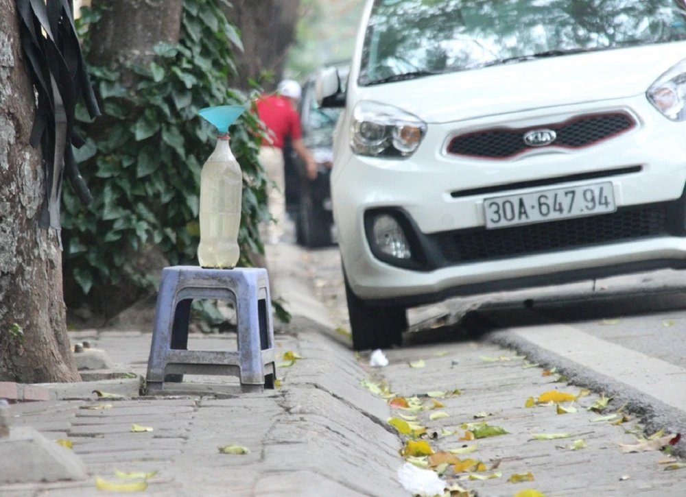 Một tiệm bán xăng ở đường Quán Thánh sử dụng chiếc ghế cùng một chai nhựa nhỏ có chiếc phễu phía trên để làm dấu hiệu nhận biết.