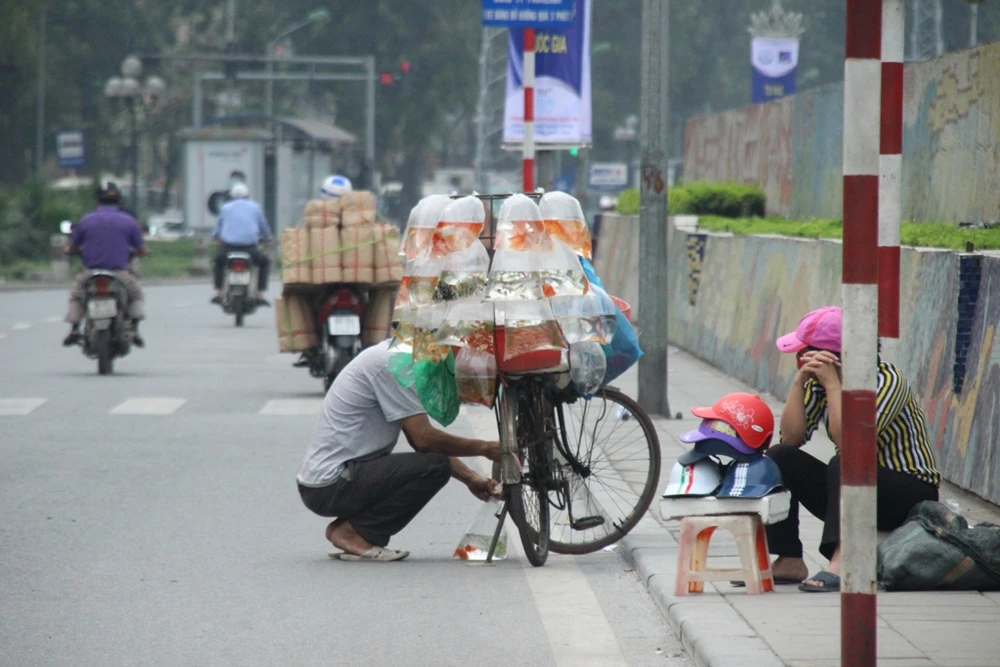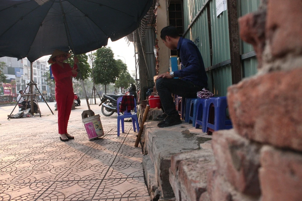 Tuy nhiên, cũng bởi bị dẹp, nhiều người xưa nay "bám" vỉa hè để kiếm sống thì này bỗng chốc bị mất nơi mưu sinh. Để ứng phó, một số đã tận dụng những khoảng trống vỉa hè ít ỏi để tiếp tục buôn bán. Trong ảnh là một quán trà đá với diện tích chỉ khoảng hơn một m2.
