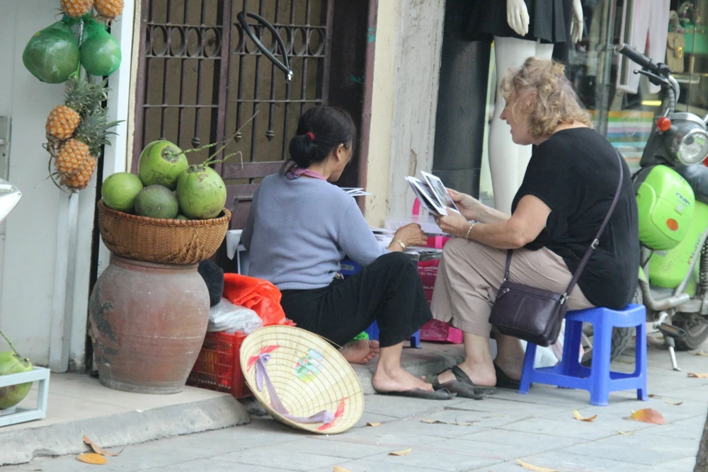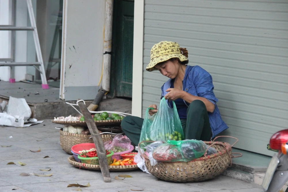 Một người phụ nữ bán hàng rong trên phố Hàng Bông tranh thủ ngồi bán trước một cửa hiệu đang đóng cửa.