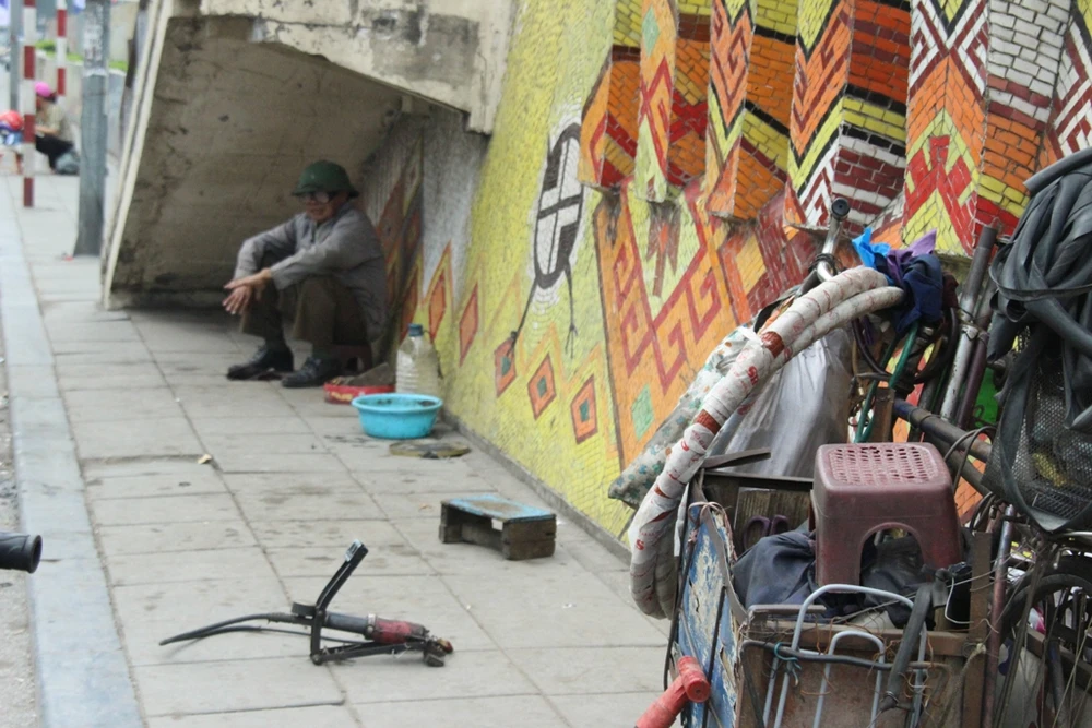 Còn người đàn ông này thì tận dụng khoảng trống phía dưới gầm một bậc thang lên xuống trên đường Yên Phụ. Công việc của ông là bơm, vá và thay xăm, lốp cho xe đạp.