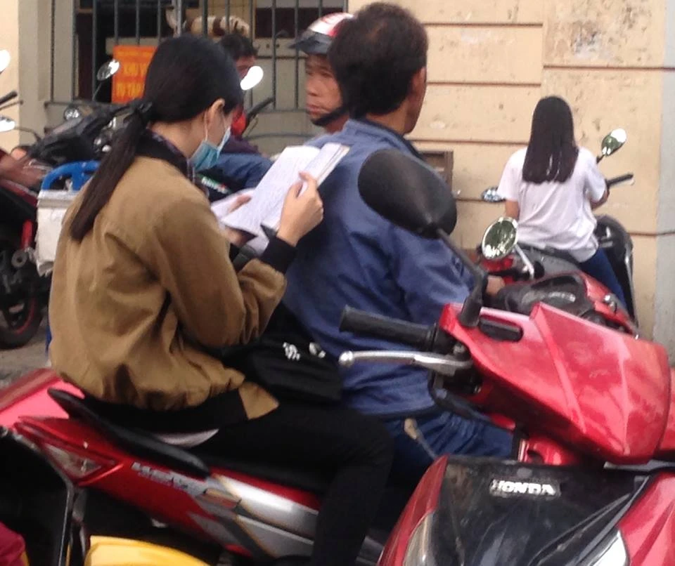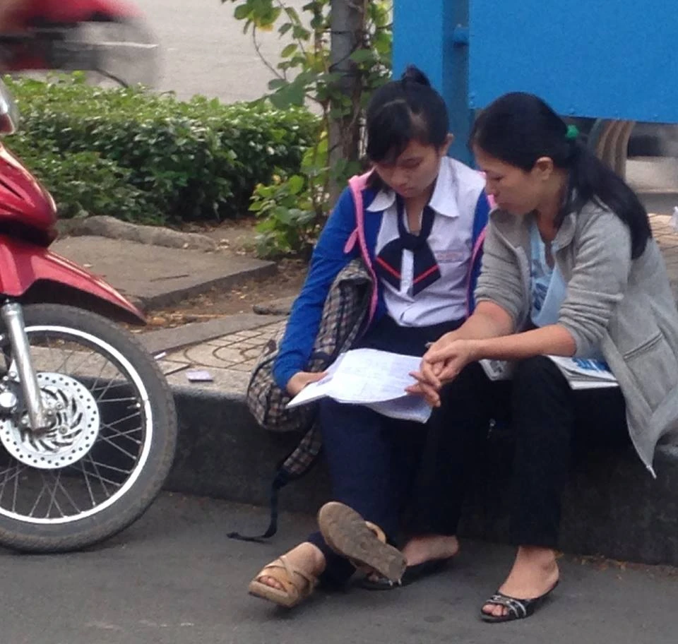 Hai cha con ngồi quá nước trước Trường ĐH Khoa học tự nhiên để ôn bài
