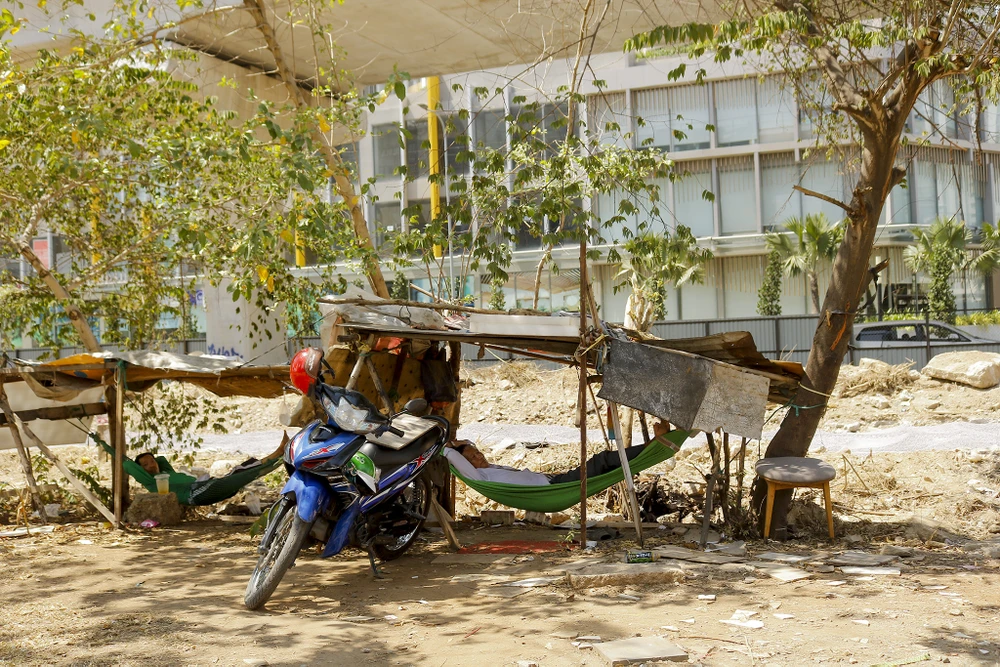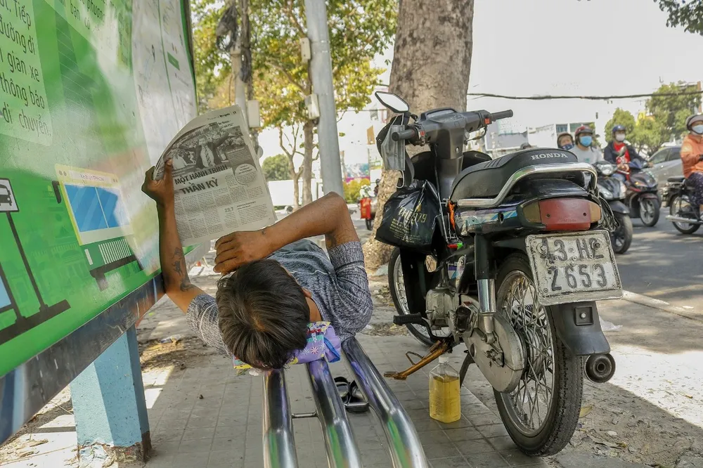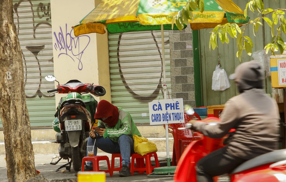 Trạm xe buýt, cây xăng và chỗ có bóng mát... là những nơi tránh nắng thường xuyên của xe ôm, shipper, người bán vé số.
