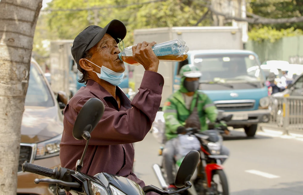 Ông Một (chạy xe ôm) dừng xe dưới tán cây dầu, uống vài ngụm nước để dịu lại cơn khát trong khi chờ khách. Như bao người lao động khác, ông cũng đang chống chọi để mưu sinh dưới thời tiết nóng bức của Sài Gòn. -" Nóng quá! tôi đem hẳn 3 chai nước , cộng lại cũng gần 5 lít. Trời nóng bức như thế này cũng lười đi làm lắm, nhưng tôi kiếm sống mà, tôi đâu nghỉ được" - Ông Một chia sẻ.