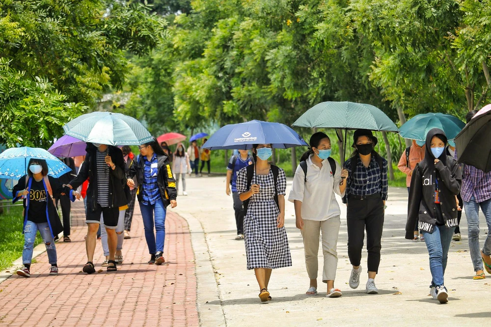 Sinh viên Khu đô thị Đại học Quốc gia TP.HCM che dù khi đi chuyển giữa trưa nắng.