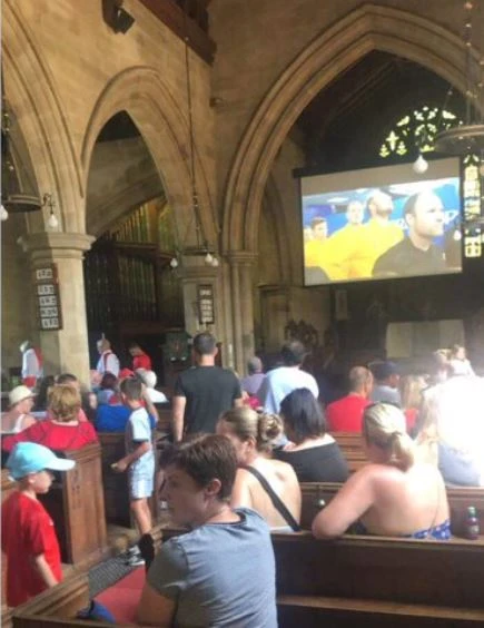 Thậm chí một nhà thờ trình chiếu cả trận bóng tại nhà nguyện. Ảnh: Twitter