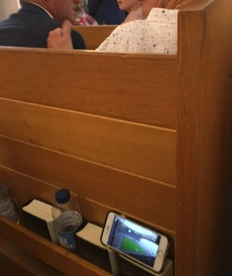Một khách coi lén bóng đá khi dự lễ cưới tại nhà thờ. Ảnh: Twitter