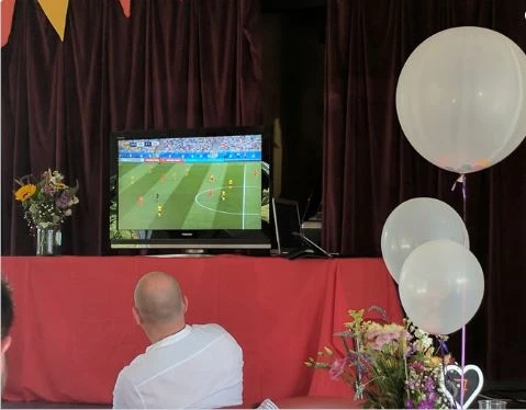 Họ trang bị màn hình chiếu, tivi, bảng theo dõi tỉ số để khách tham dự lễ cưới ngoài việc chung vui cũng không phải tiếc nuối khi bỏ lỡ một trận đấu hay.