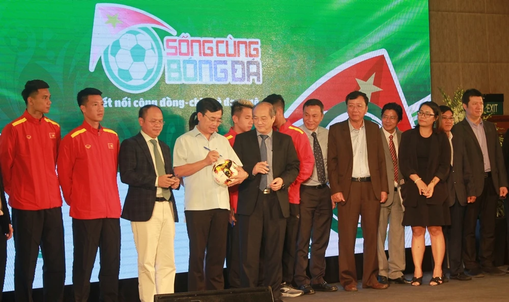 Các đại biểu và cầu thủ ký tên vào quả bóng trong buổi lễ. Ảnh: VIẾT LONG