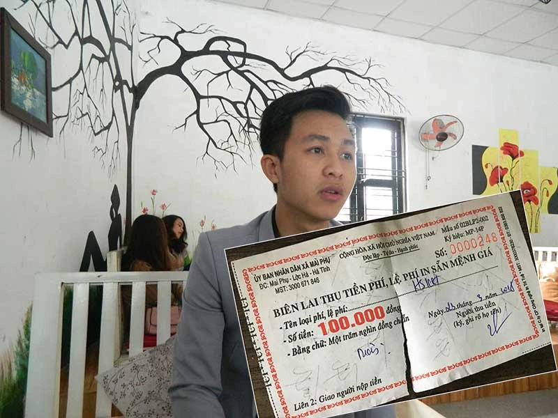 Anh Trịnh Văn Tuấn, trú xóm Hợp Tiến, xã Mai Phụ, huyện Lộc Hà (Hà Tĩnh) khi ra xã xin xác nhận tình trạng hôn nhân đã phải đóng khoản phí 100.000 đồng. Trong đó, phí xác nhận chỉ 10.000 đồng còn 90.000 đồng là tiền… đóng góp xây dựng quê hương.