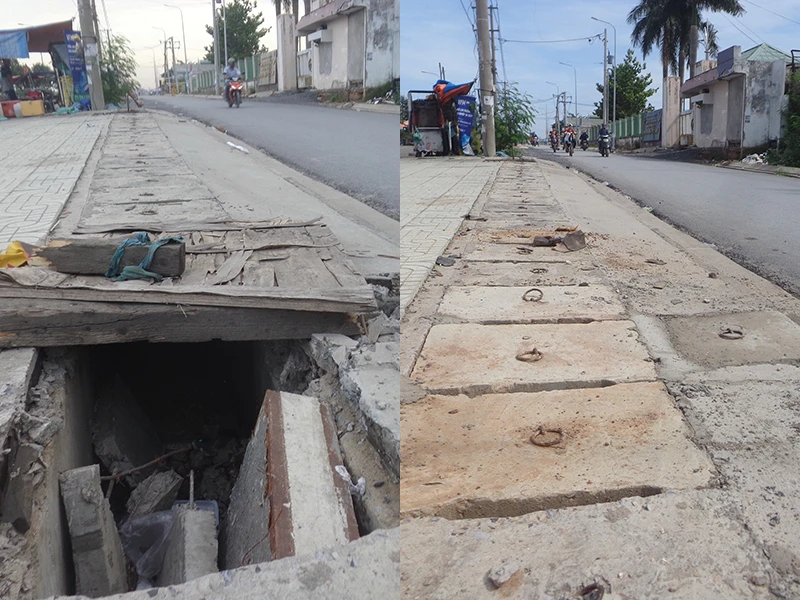 Người dân nơi đây cho biết hai nắp mương thoát nước này bị hỏng đã lâu nhưng chưa được thay nắp mới (ảnh trái).